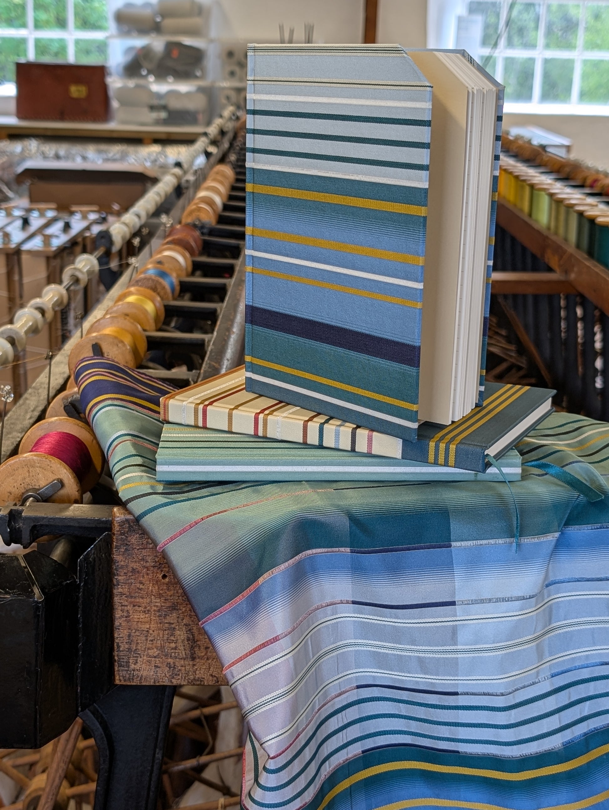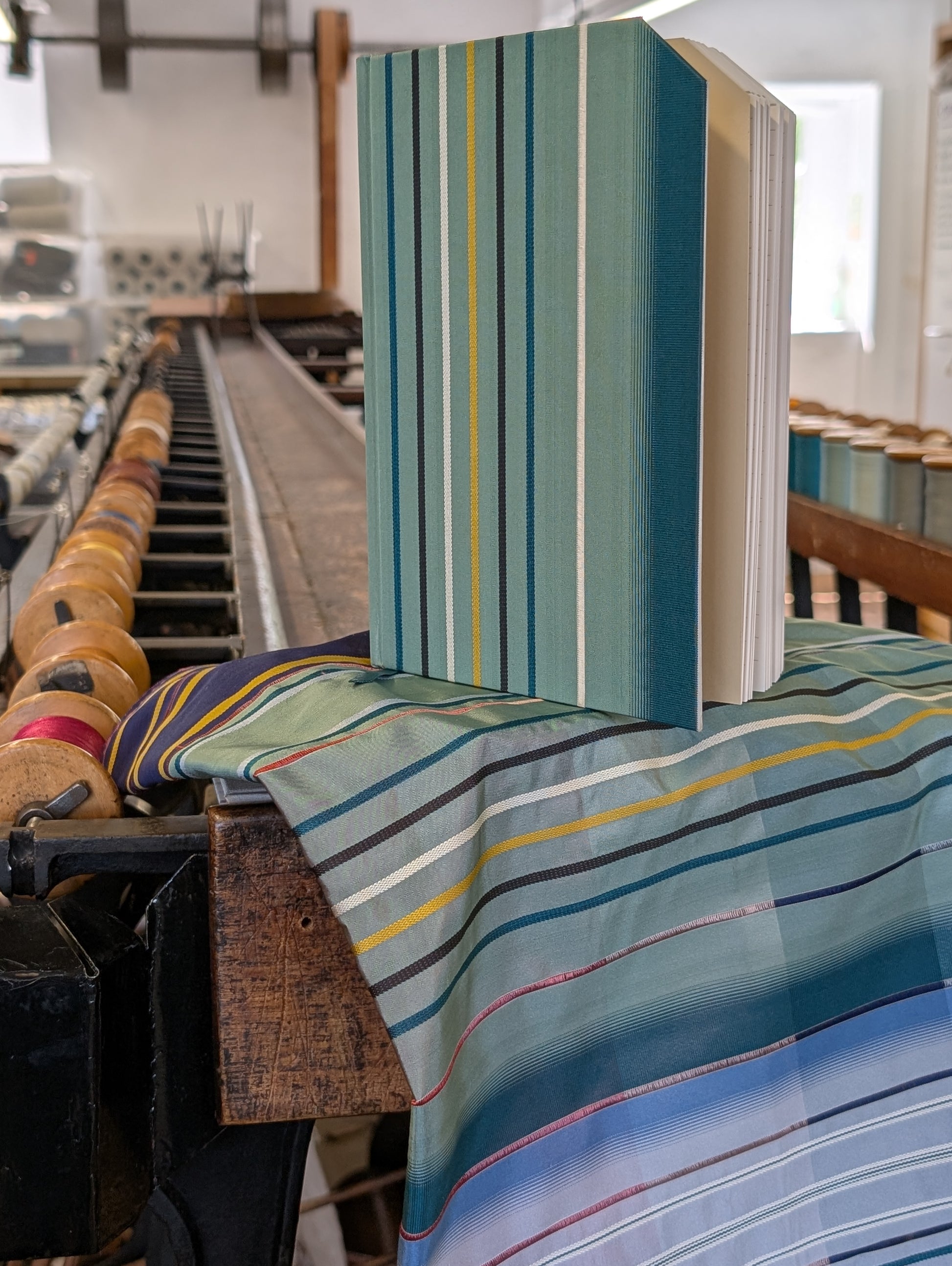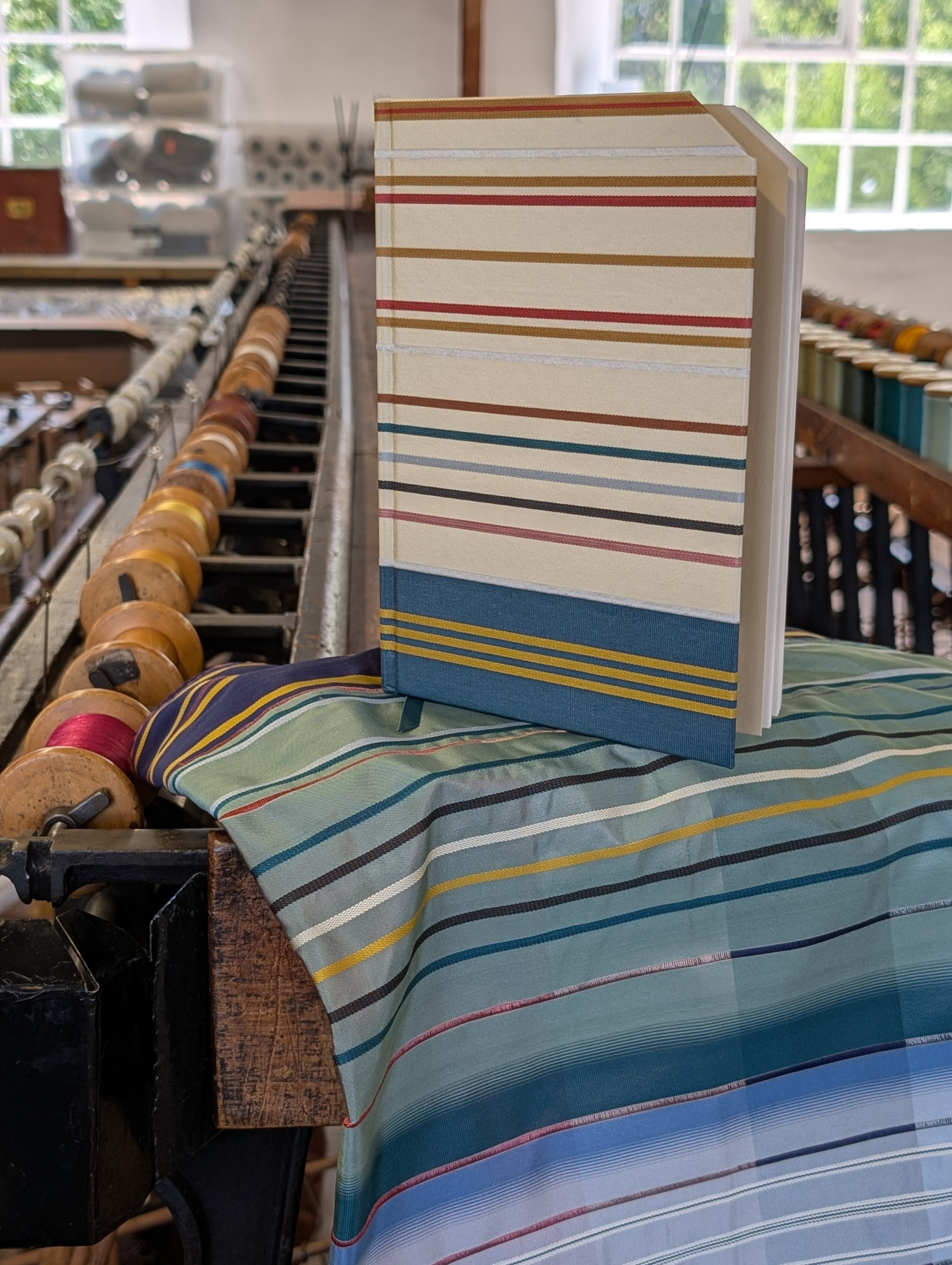 A5 notebook covered with silk ribbon woven on our Victorian looms in a creative collaboration with Jane Austen’s House.