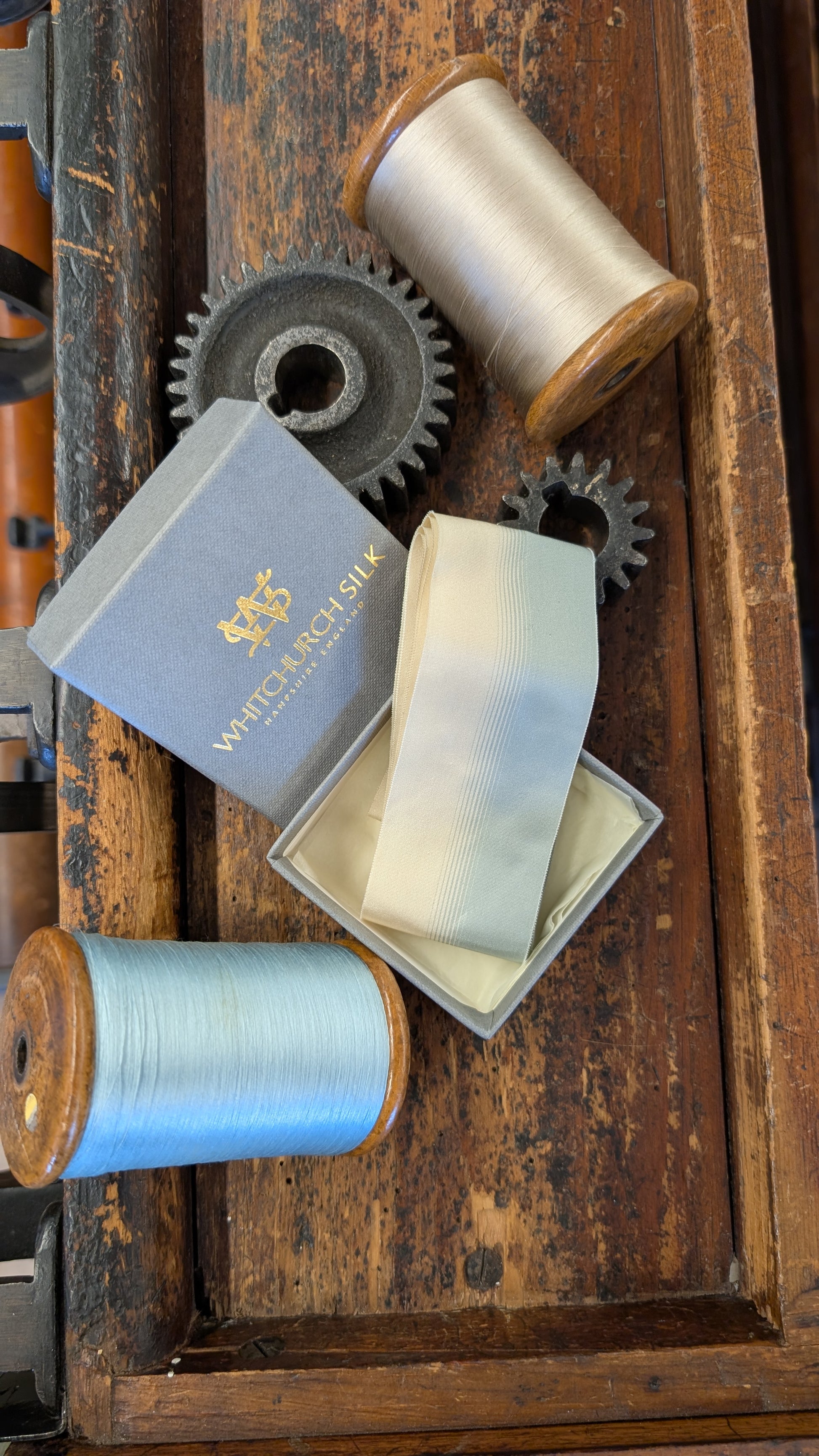 Our highly skilled team of Weaver Tacklers have wound, warped and woven these beautiful silk ribbons using traditional skills and our historical machinery; before trimming each ribbon individually by hand.