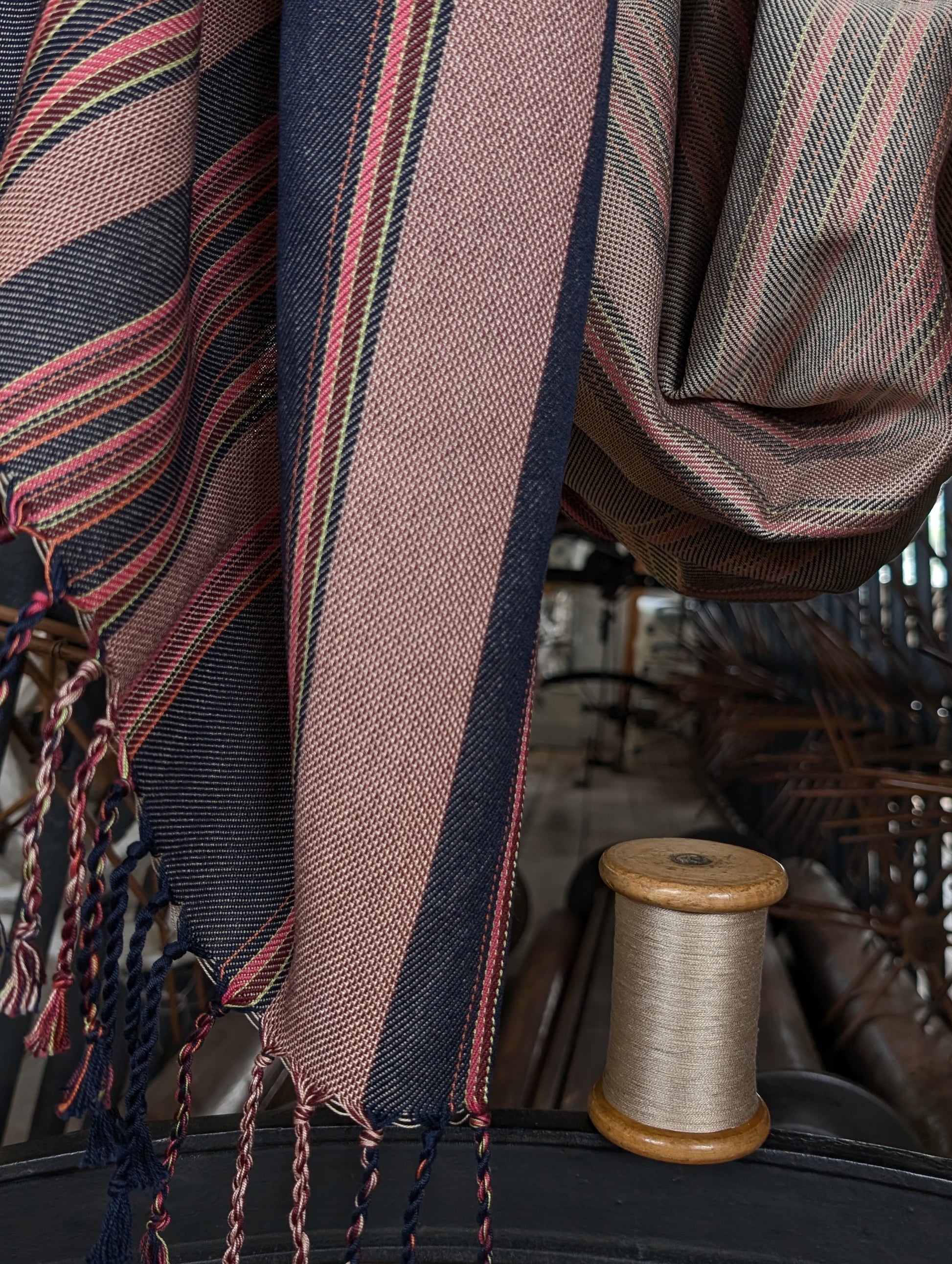 Colour: Striped warp (vertical) of navy, lime, oyster and pinks. Weft (horizontal) mushroom.