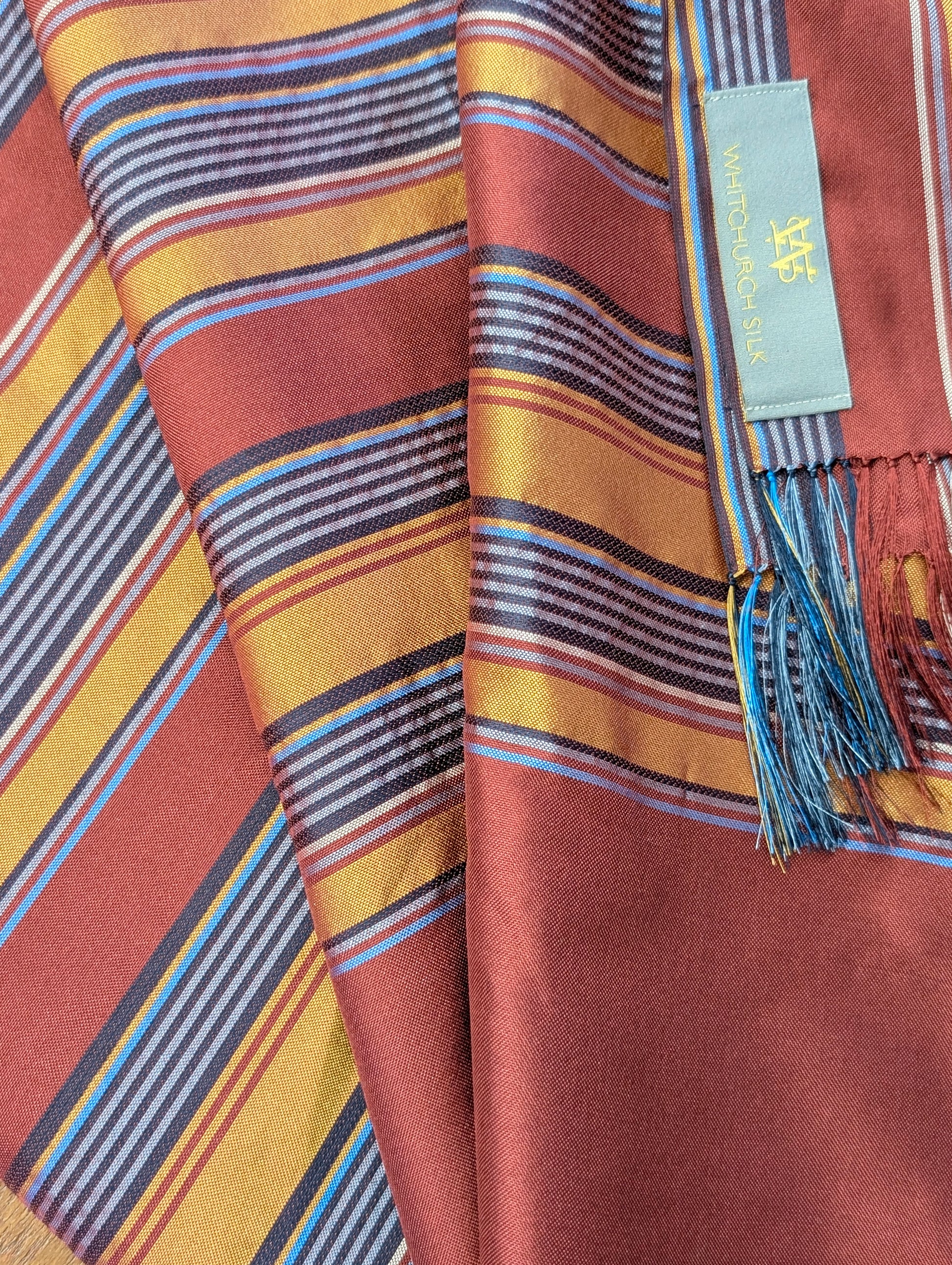 Scarf is 100% silk. Stripes with raised satin stripes. Woven dimensions approximately 150 x 40cm. Woven in Hampshire at Whitchurch Silk Mill.