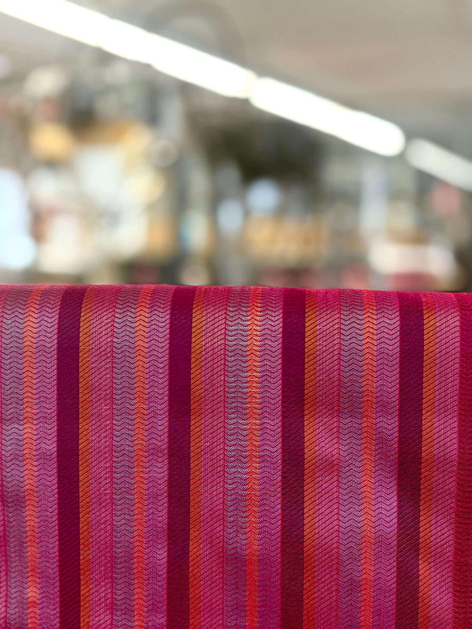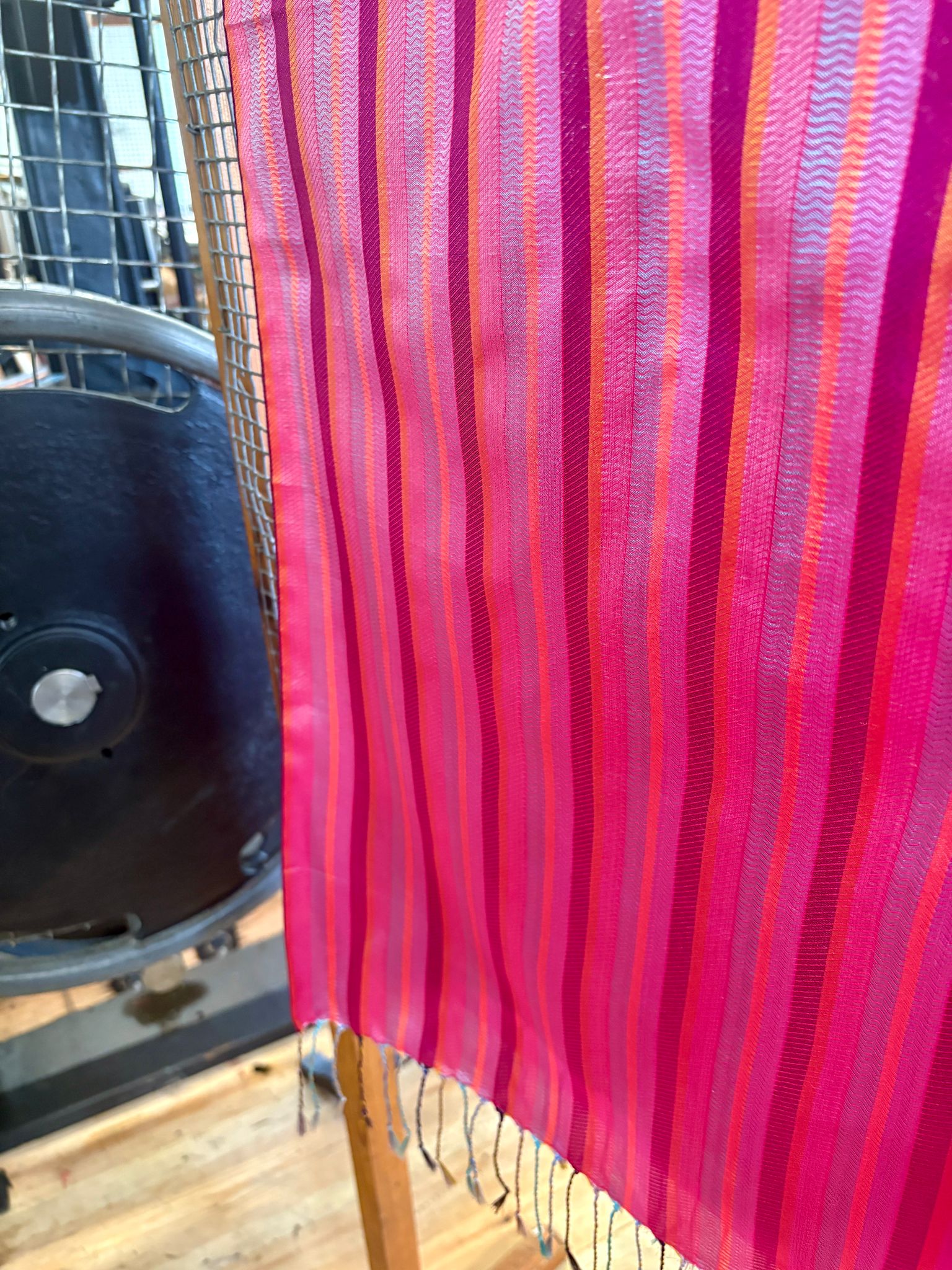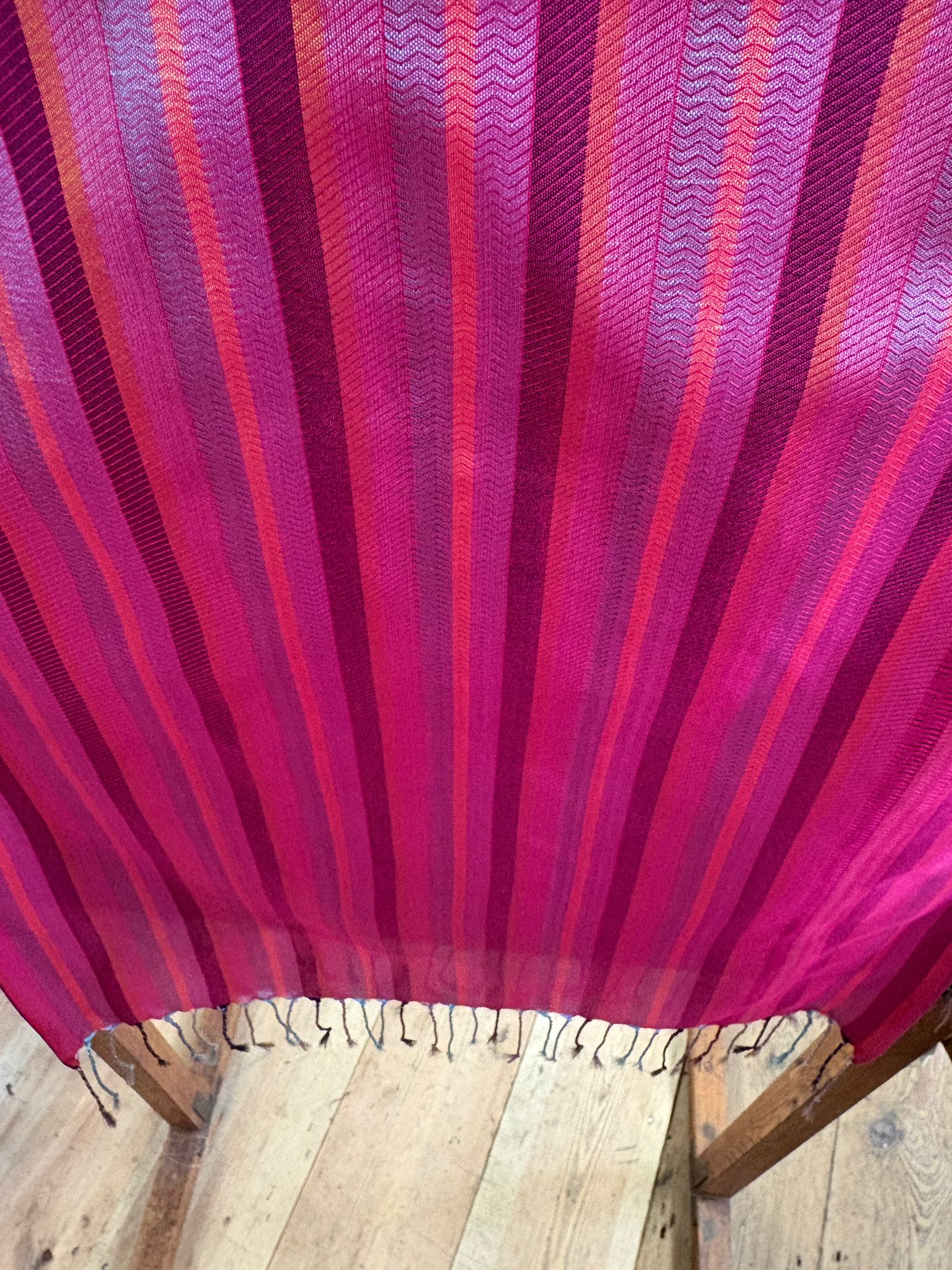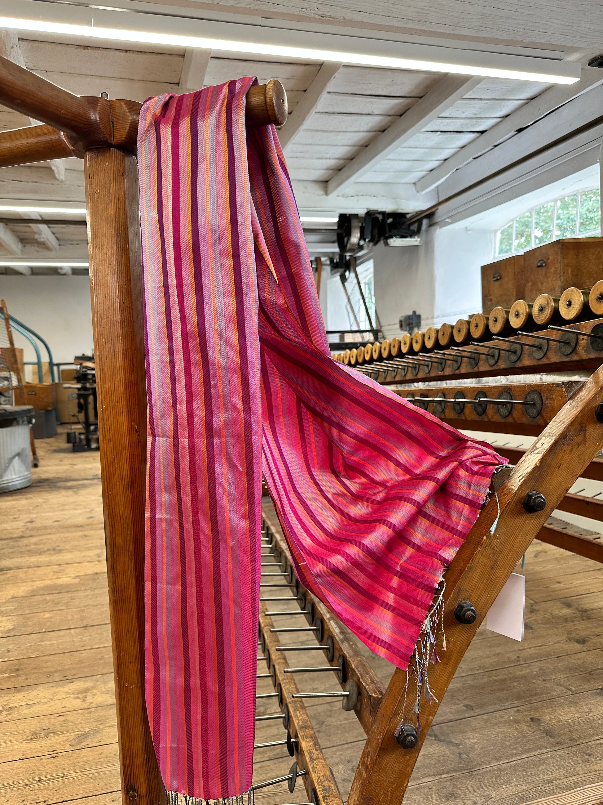 In the past, our Whitchurch Silk stripes were created by weavers at the Mill using ‘cone ends’ to avoid any wastage. Taking inspiration from this, our Weaver Tacklers have designed this stripe rather from bobbins left over. A combination of colours used for previous silks, these beautiful scarves harness a selection of jewel like colours that are perfect for brightening up any outfit. Designed, wound and woven by our small team of highly skilled Weaver Tacklers using our historic machinery, before being tasselled by hand in house.