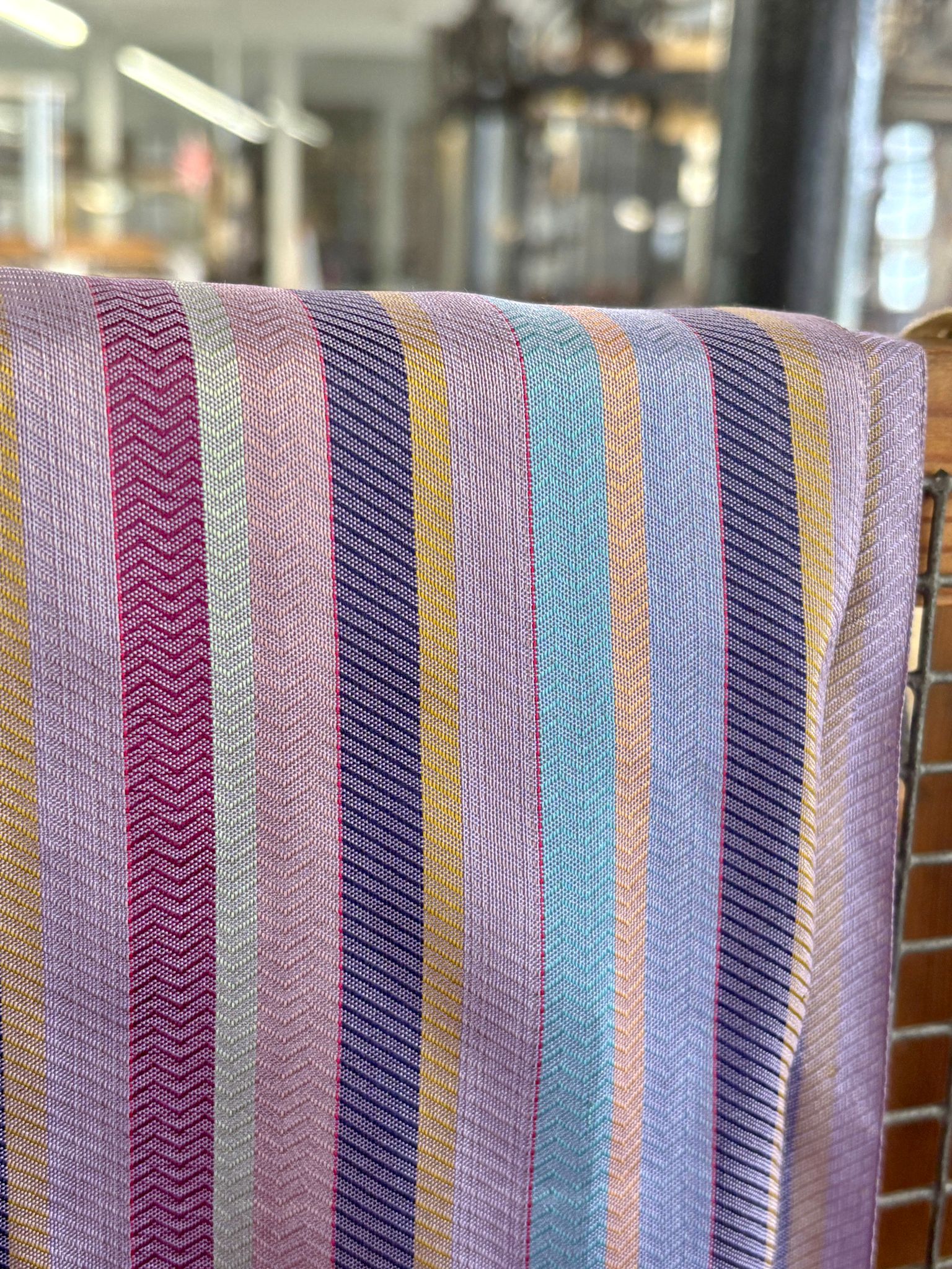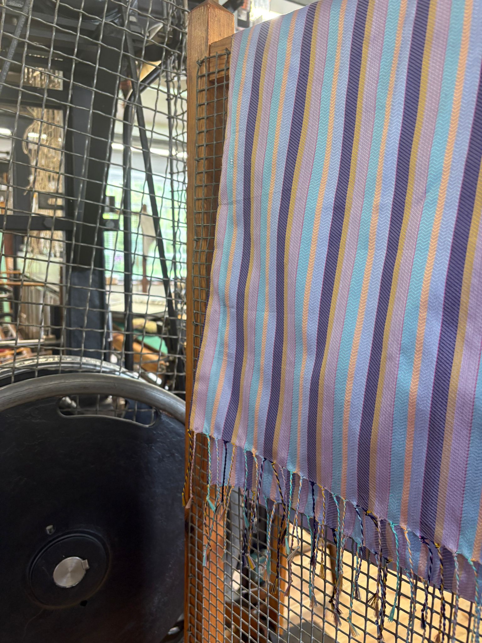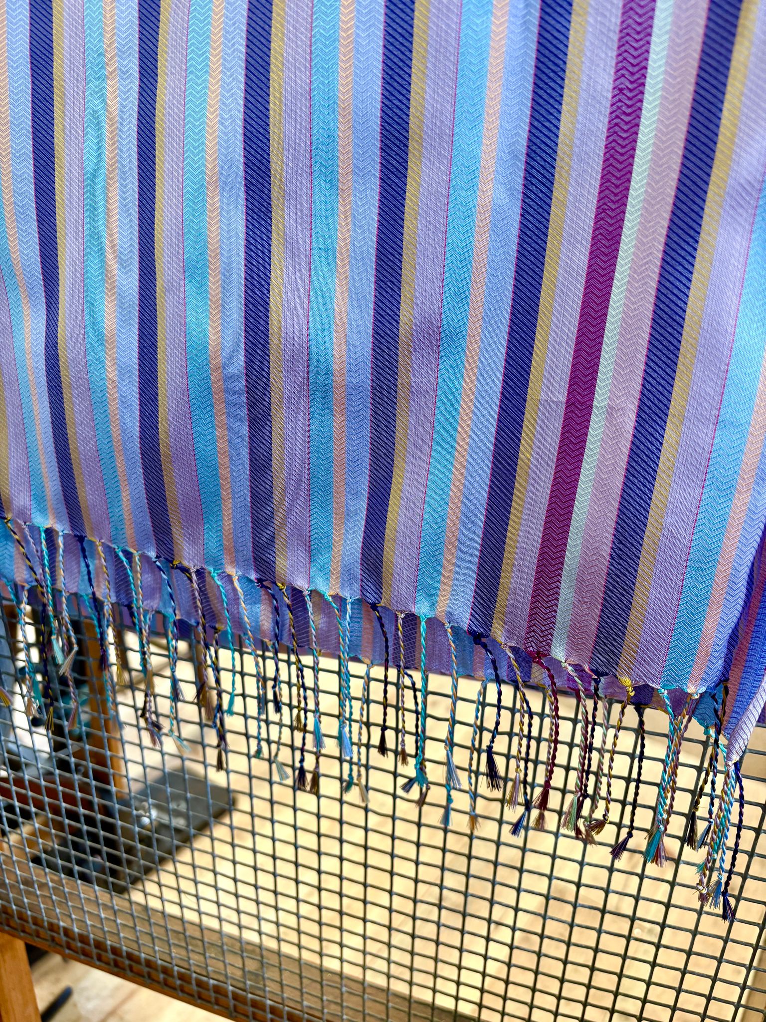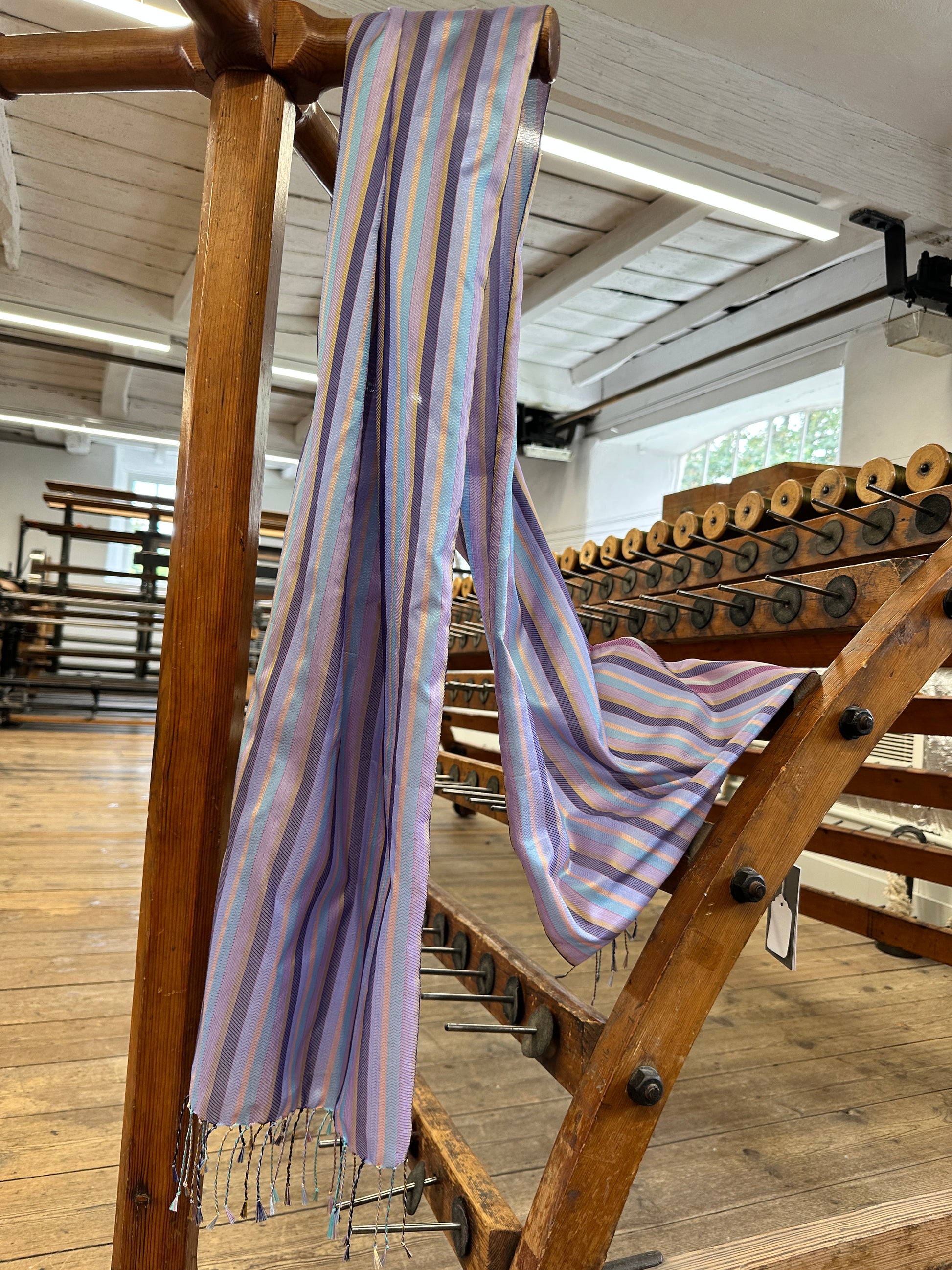 In the past, our Whitchurch Silk stripes were created by weavers at the Mill using ‘cone ends’ to avoid any wastage. Taking inspiration from this, our Weaver Tacklers have designed this stripe rather from bobbins left over. A combination of colours used for previous silks, these beautiful scarves harness a selection of jewel like colours that are perfect for brightening up any outfit. Designed, wound and woven by our small team of highly skilled Weaver Tacklers using our historic machinery, before being tasselled by hand in house.