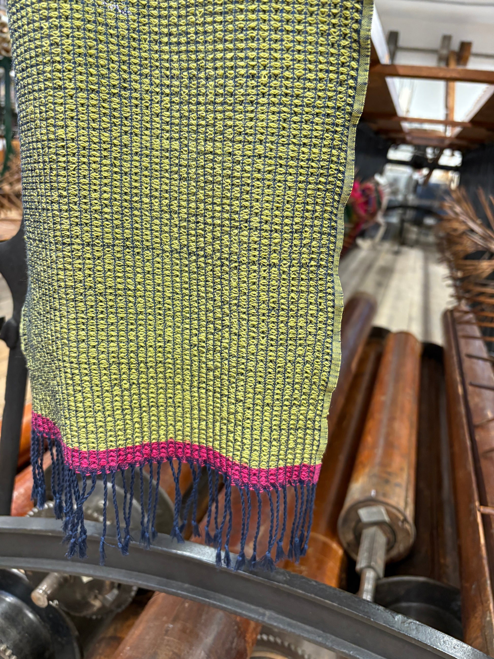 Wound, warped and now hand woven here at the Mill. Woven in a honeycomb structure, a navy warp with jewel like weft colours. 100% spun silk for a soft and cosy end result. Each scarf has been fringed by hand in house by our weaving team.